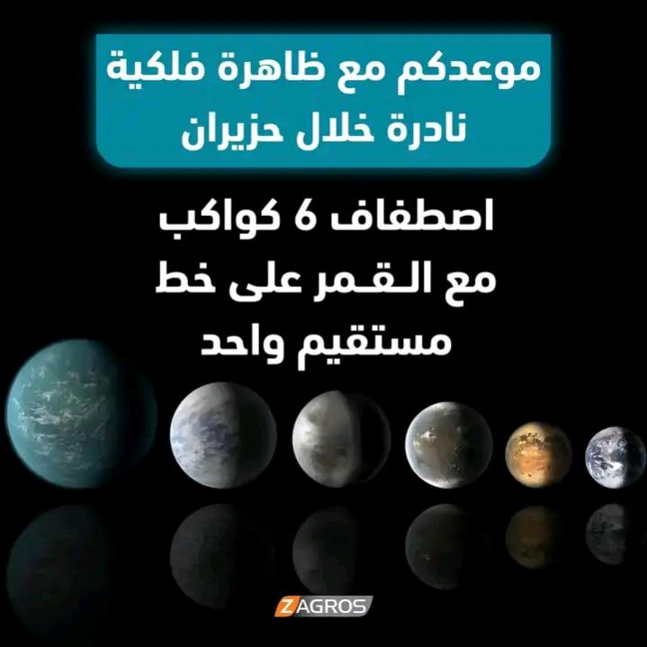 سيكون العالم على موعد مع حدث فلكي نادر لا يراه الشخص سوى مرة واحدة في حياته يعرف بظاهرة "اصطفاف الكواكب"، حيث تصطف 6 كواكب هي عطارد والمريخ والمشتري وزحل وأورانوس ونبتون ويلحق بهم القمر في الثالث من شهر حزيران المقبل لترى بالعين المجردة في السماء بوضوح